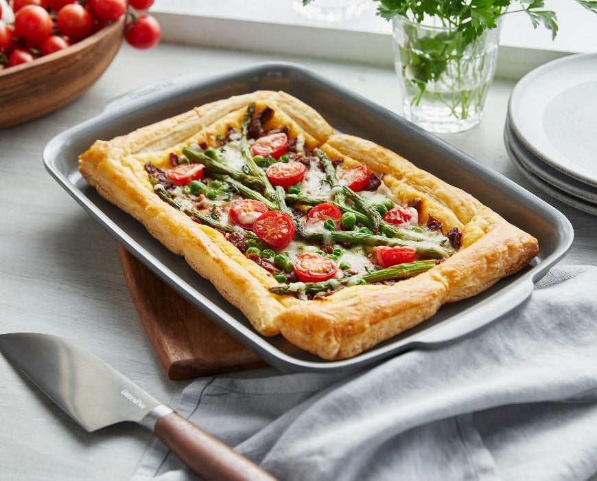 Sur un plan de travail légèrement fariné, étaler la pâte feuilletée en un rectangle d'environ 16 centimètres sur 12. Il n'est pas nécessaire d'être très précis - le fond de votre plaque de cuisson devrait suffire, ajustez donc en conséquence. Placez la pâte feuilletée dans le moule. Pour créer un bord surélevé, utilisez un couteau bien aiguisé pour découper une bordure de 1,2 cm sur tout le pourtour.